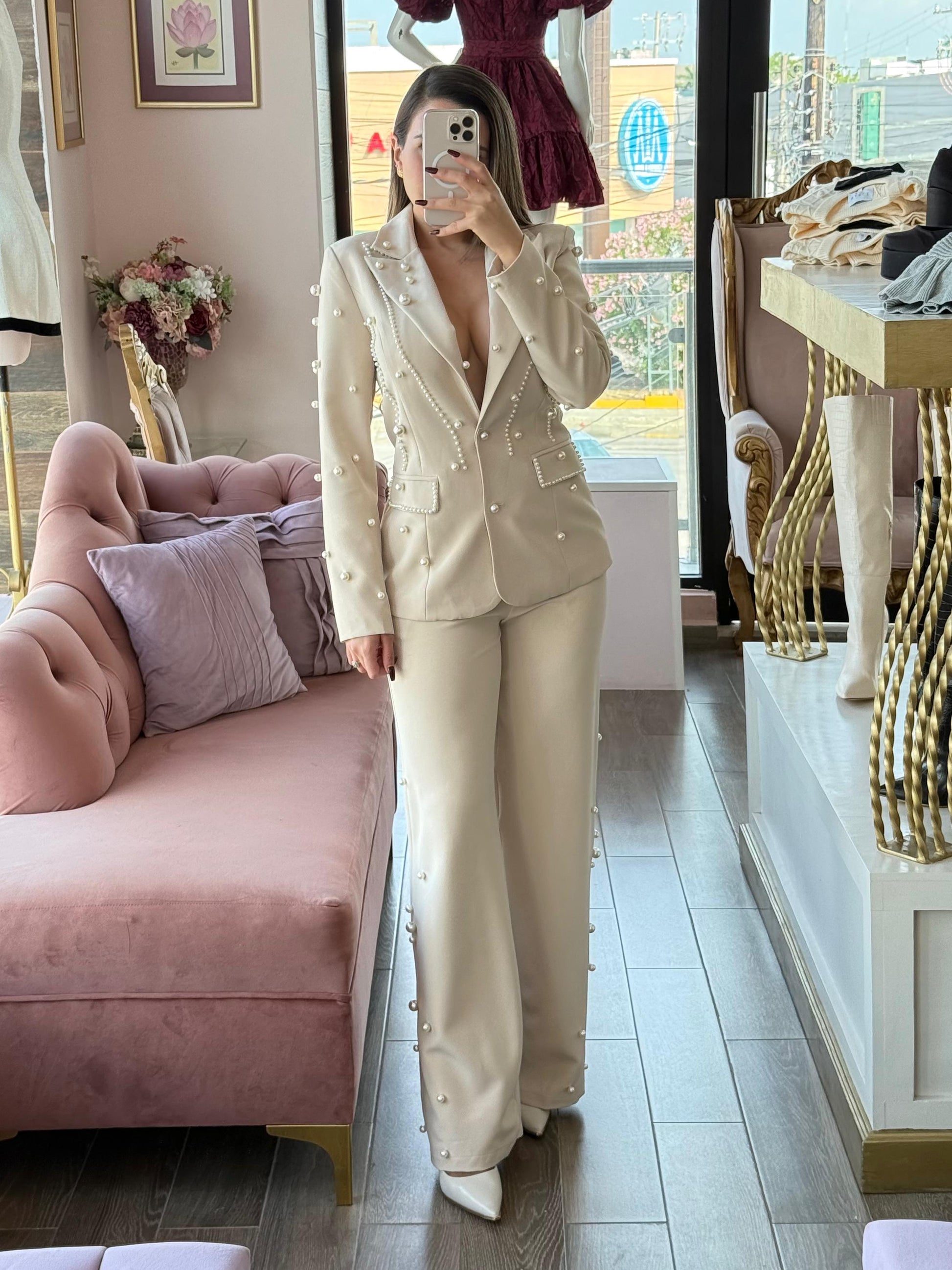 Set beige con aplicaciones de perlas en blazer y pantalón